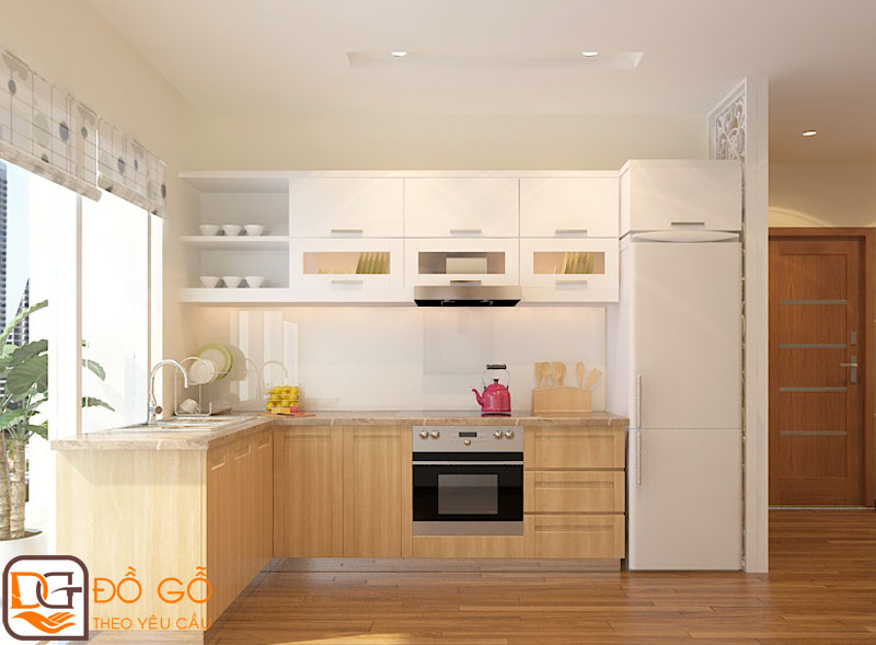 Tủ bếp chữ L phù hợp với mọi không gian bếp từ chung cư cho đến nhà phố, mẫu nội thất hiện đại thể hiện được cá tính riêng của gia chủ và cả không gian nội thất phòng bếp